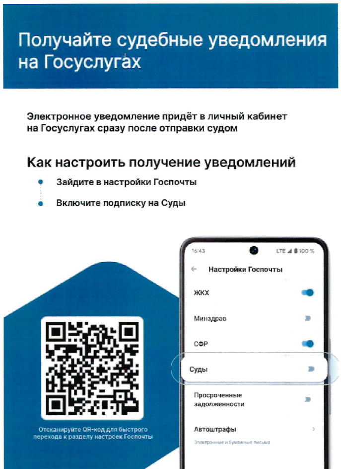 Электронное уведомление придет в личный кабинет на Госуслугах сразу после отправки судом.